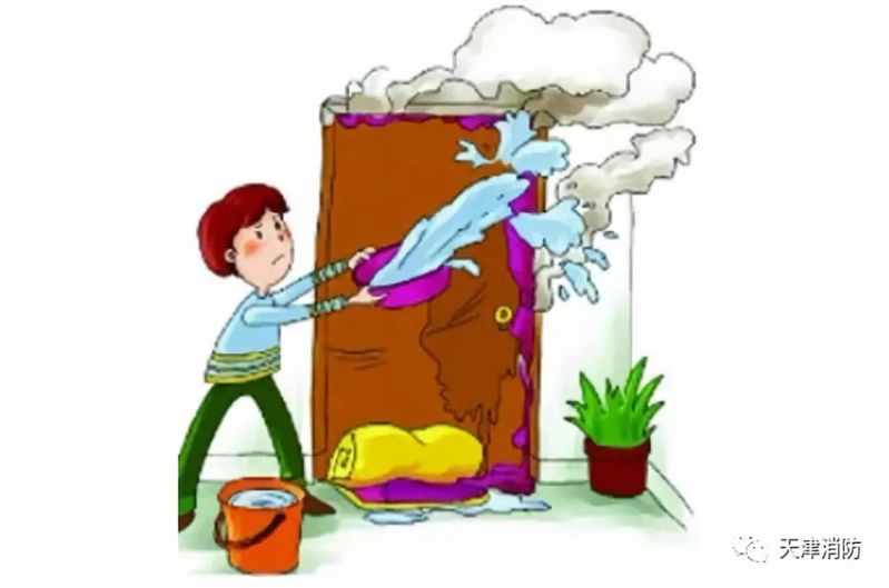 將毛毯等織物夾在門上,并澆水,防止外部火焰及煙氣侵入,抑制火勢蔓延。