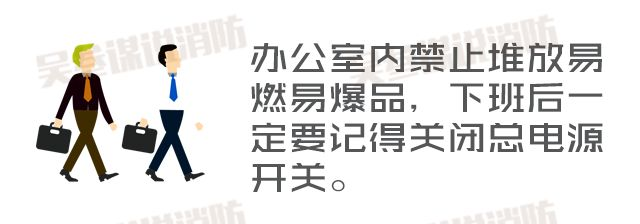 辦公區(qū)域禁止吸煙,也不要在辦公室動火,如焚燒紙張、煮食物等。辦公區(qū)域的疏散通道要保持暢通,平時要熟悉安全出口位置和逃生路線。