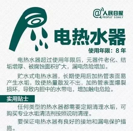 4、電熱水器的使用壽命通常為6-8年,如超過年限還在繼續(xù)使用,就會存在安全隱患,需要及時更換。