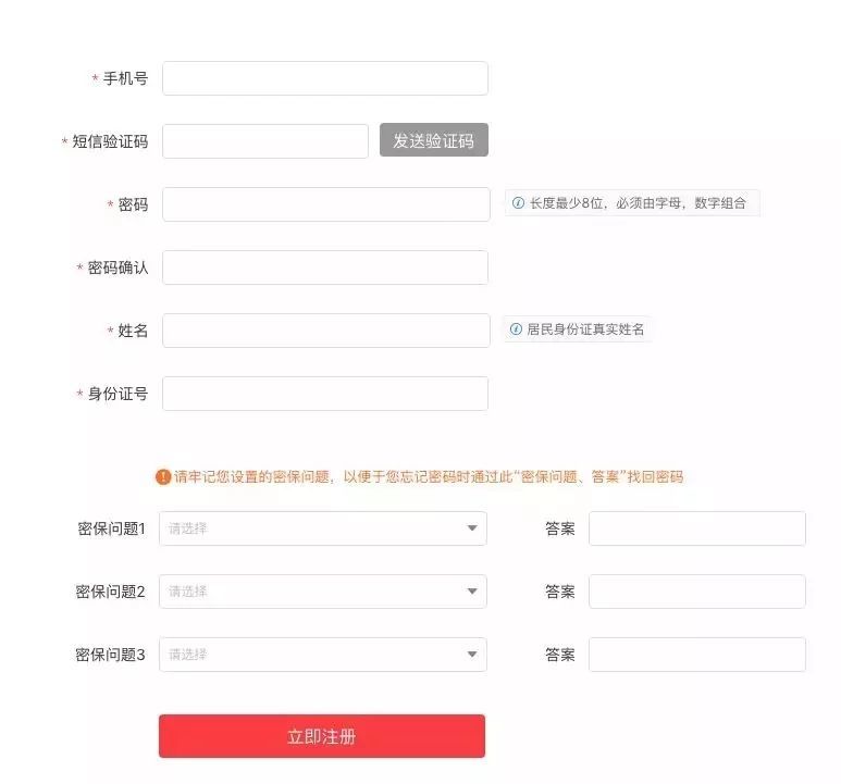 報(bào)名人員通過(guò)互聯(lián)網(wǎng)進(jìn)行網(wǎng)上報(bào)名前需要進(jìn)行網(wǎng)站注冊(cè),注冊(cè)時(shí)需填寫手機(jī)號(hào)、短信驗(yàn)證碼、密碼、密碼確認(rèn)、姓名、身份證號(hào)并選填密保問(wèn)題。報(bào)名人員注冊(cè)成功后,手機(jī)號(hào)將作為登錄網(wǎng)站的賬號(hào),不可修改。