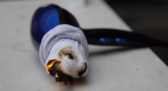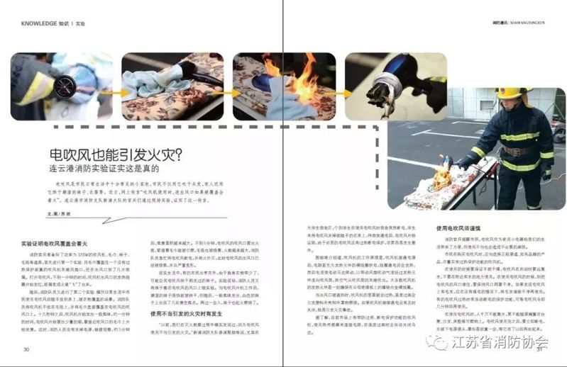 實驗現(xiàn)場,消防人員又將襪子套在吹風機的風口上做實驗。當吹風機開機工作后,潮濕的襪子很快就被烘干,但隨后,一股焦味發(fā)出,白色的襪子上出現(xiàn)了幾處黃色焦點。再過一會兒,襪子也起火燃燒了。